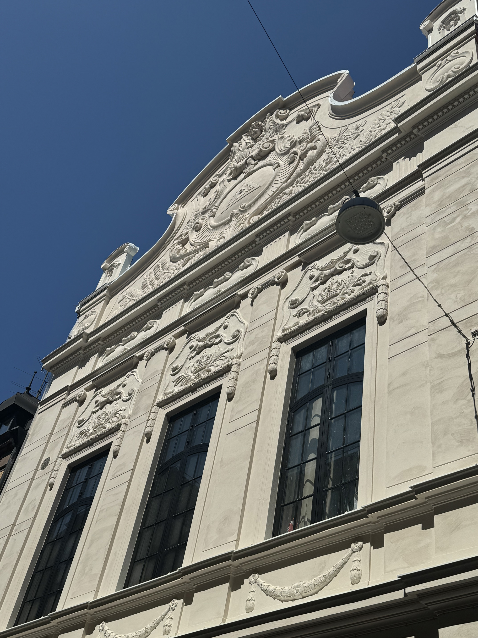 Efter en renovering som utfördes på 90-talet då man i stort sett förstörde fasaden på grund av fel val av material har vi nu återskapat och räddat denna vackra fasad. Kalkputs, kalkfärg, traditionella mallar och våra extremt duktiga hantverkare.