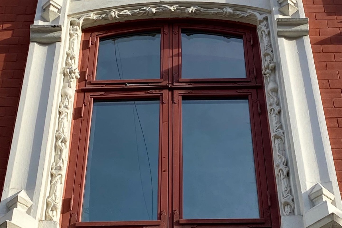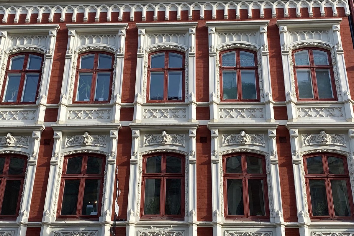 Fasadrenovering av utsmyckningar och ommålning av fasad.