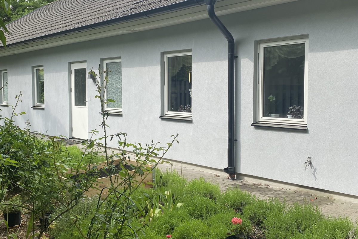 Uppfräschning av fasad. På denna villa har vi tunnputsat och kratsat fasaden med Webers EF-puts.