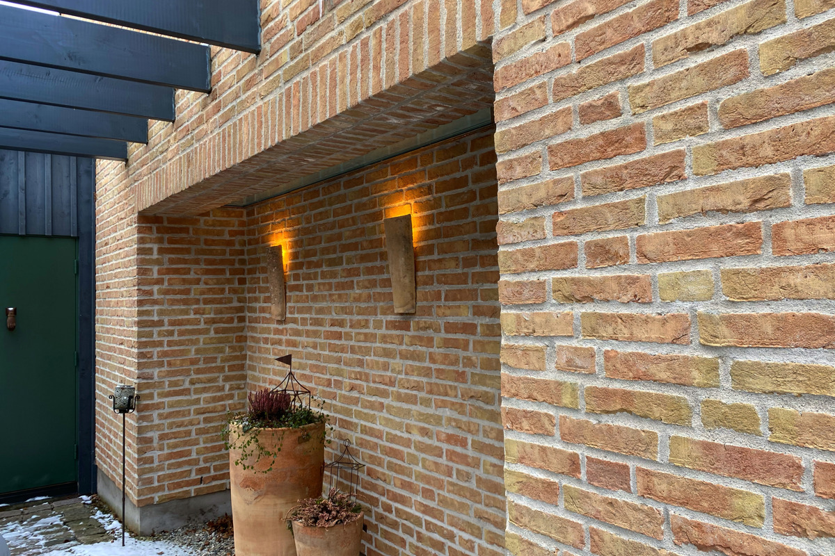 På denna villa i Bunkeflo har vi murat stomme och fasad på tillbyggnad som blev ett bibliotek. Vi har använt oss av gulröd handslagen schatterad tegel till både stomme och fasad.